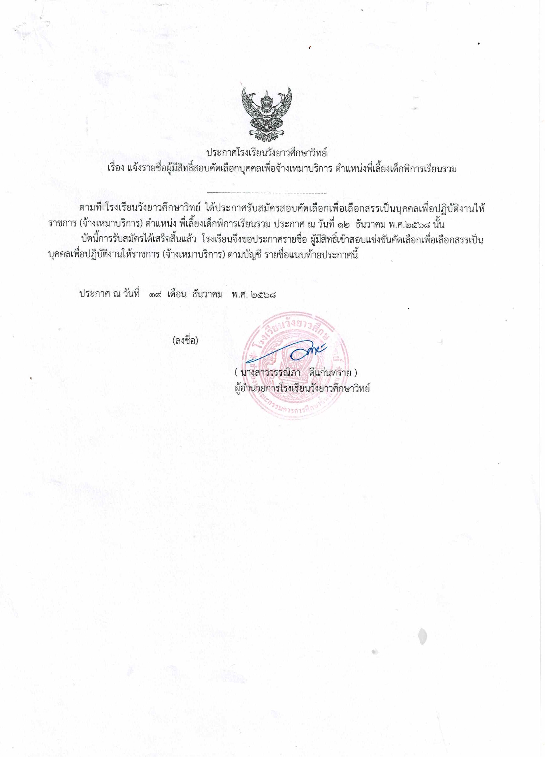 ประกาศโรงเรียนวังยาวศึกษาวิทย์ เรื่อง แจ้งรายชื่อผู้มีสิทธิ์สอบคัดเลือกบุคคลเพื่อจ้างเหมาบริการ ตำแหน่งพี่เลี้ยงเด็กพิการเรียนรวม