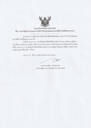 ประกาศโรงเรียนวังยาวศึกษาวิทย์ เรื่องประกาศผู้ชนะการเสอนราคาจัดจ้างปรับปรุงซ่อมแซมระบบไฟฟ้า โดยวิธีเฉพาะจง